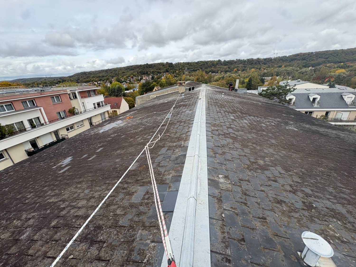 Nous sommes intervenus à Gif-sur-Yvette pour la réparation d’une large toiture en ardoise située en hauteur sur un grand bâtiment.